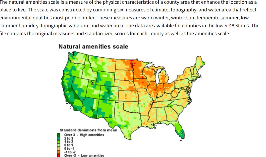 My favorite subset of ERS data is its Natural Amenities Scale. Yes, researchers have mapped the country, figuring out which combination of hill, dale, sky and sea people find most pleasing. Once that determination has been made, the question becomes whether or not people go out of their way to actually inhabit those pleasing locations. In other words, do people consciously prefer certain landscapes, and make it a point to live there? If so, do they chose that place with a great view, even if it means a longer commute to work, or minimal access to services? Or do they swallow the pill of flat lands and gray skies, if it makes the work of life easier, or if they have friends and family nearby?